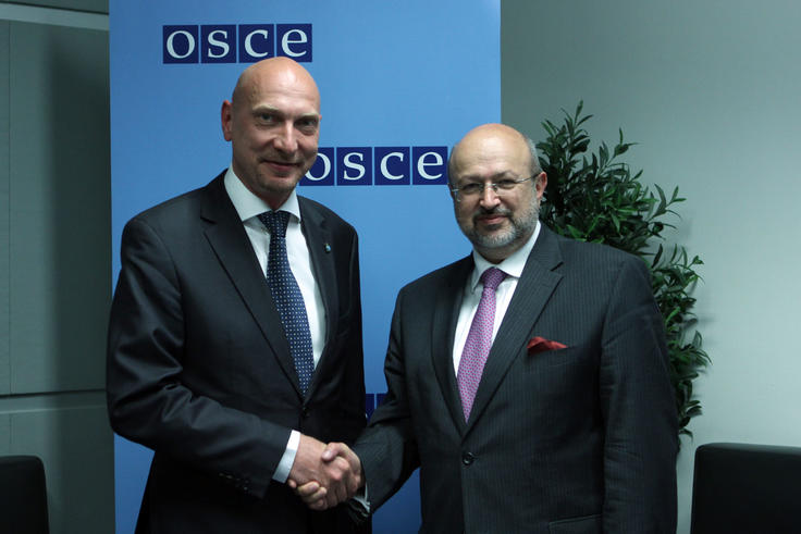 OSCE Secretary General Lamberto Zannier (r) and Clemens Wechner of INTERPOL shake hands following the signing of a Memorandum of Understanding on enhancing collaboration in the area of law enforcement training, Vienna, 27 May 2014.