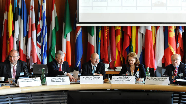 (L-r) Peter van Tuijl, GPPAC Executive Director; Yves Leterme, Secretary General at the International Institute for Democracy and Electoral Assistance; OSCE Secretary General Lamberto Zannier, Ivana Gajovic, Director at the Nansen Dialogue Centre in Montenegro; and Luk Van Langenhove, Director at the United Nations University Institute on Comparative Regional Integration Studies during an International Conference on strengthening peace and security co-operation towards democracy and development, Vienna, 29 April 2015.