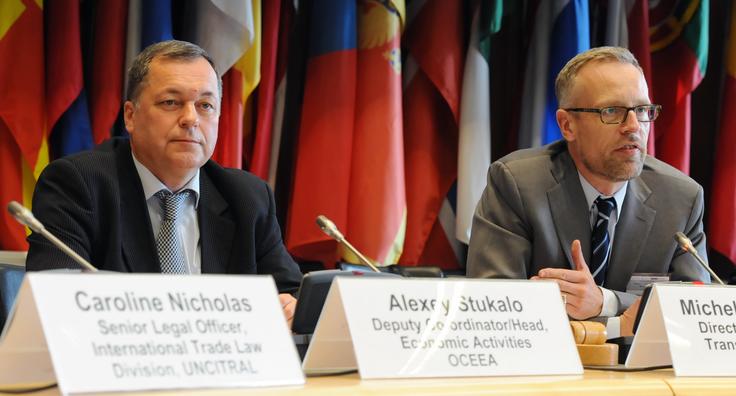 Alexey Stukalo, Deputy Co-ordinator of OSCE Economic and Environmental Activities (l) and and Michel Nussbaumer, Director of the EBRD Legal Transition Programme during an opening session at the Regional Seminar on Enhancing Public Procurement Regulation, Vienna, 28 May 2015.