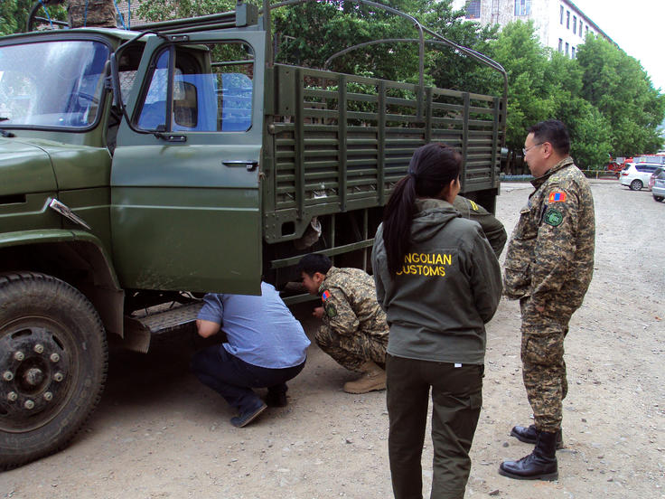 Participants of the workshop on the examination and detection of people, cargo and vehicles at the border participate in a practical exercise in Ulaanbataar, 10 June 2015.