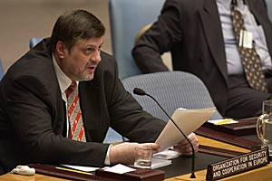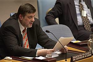 OSCE Secretary General Jan Kubis speaking at the United Nations Security Council meeting in New York, 11 April 2003.