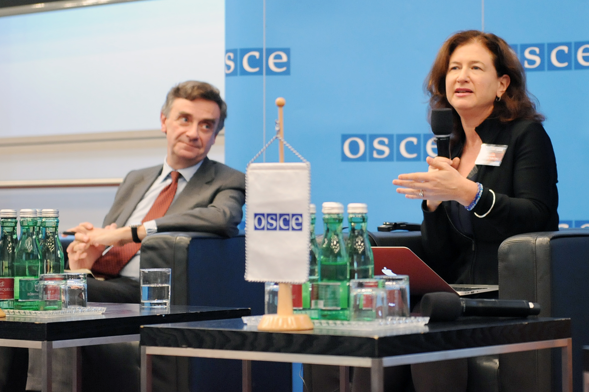 (L-r) Ambassador Thierry Béchet, Permanent Representative of the European Union to the OSCE, and moderator of the session, Suzanne Goldenberg, Environmental Correspondent at The Guardian, at the OSCE Security Days event on climate change and security, Vienna, 28 October 2015.