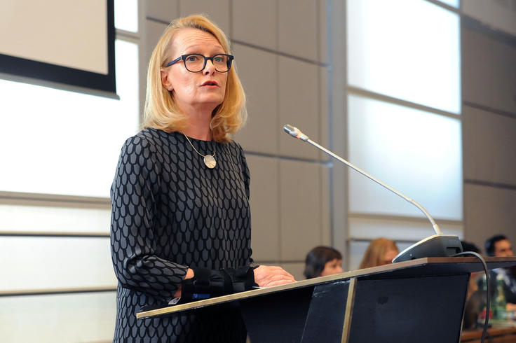 Lenita Toivakka, Finland’s Minister for Foreign Trade and Development, delivers her keynote address at the OSCE Security Days event on applying a gender perspective to peace-building, Vienna, 13 November 2015.