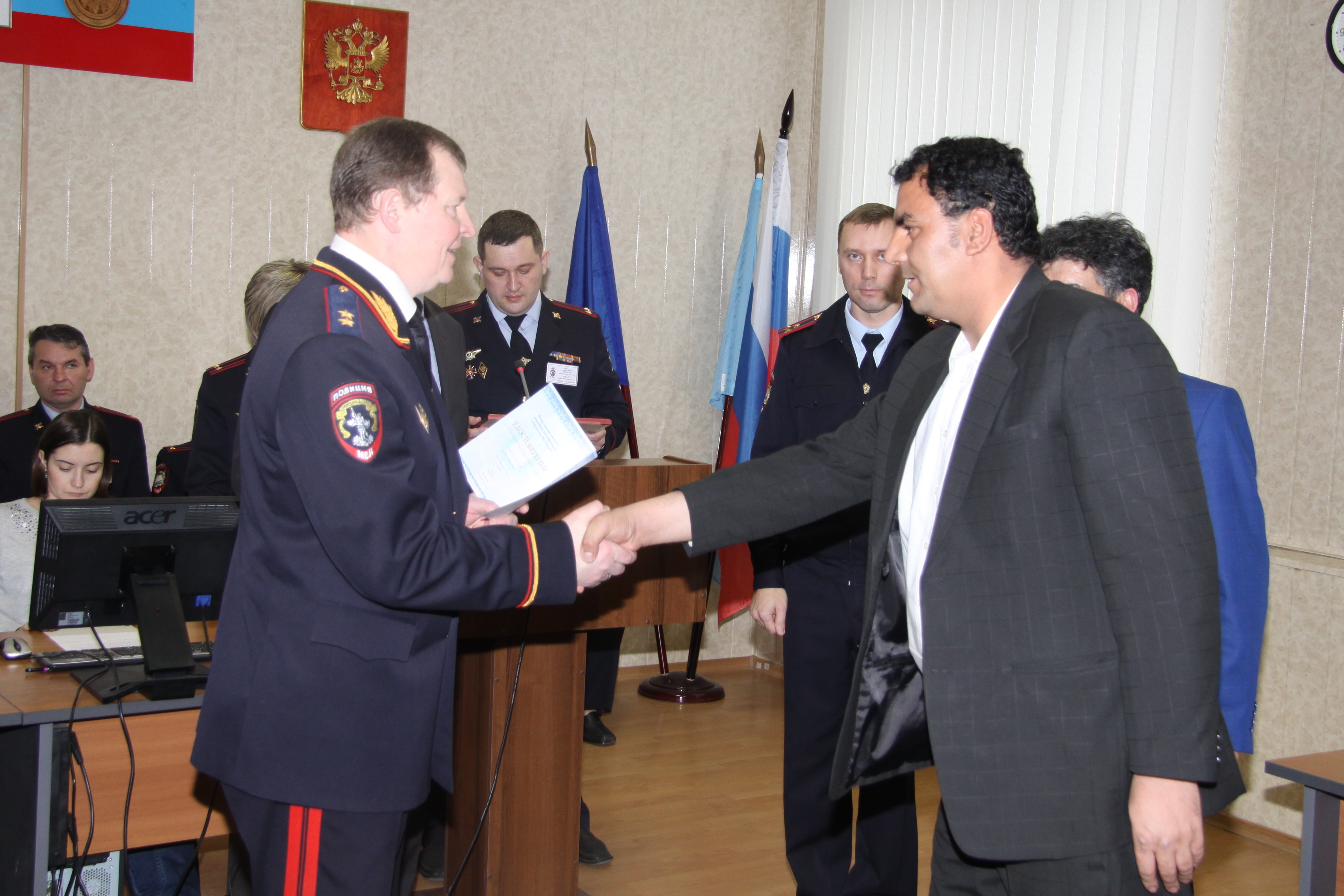 (L-r) Lieutenant General Yury Demidov, Head of the All-Russia Advanced Training Institute of the Interior Ministry, presenting a certificate to a trainee from the Afghan National Police during a closing ceremony of an OSCE-organized train-the-trainers course at a training facility, focusing on combating illicit drug trafficking and drug-related crimes, Domodedovo, 21 December 2015.