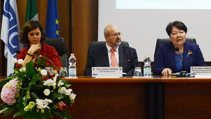 L-r: Laura Boldrini, President of the Chamber of Deputies of the Italian Parliament, and OSCE Secretary General Lamberto Zannier, listen to an address by Madina Jarbussynova, Special Representative and Co-ordinator for Combating Trafficking in Human Beings, during a conference at the Centre of Excellence for Stability Police Units (CoESPU) in Vicenza, Italy, 17 June 2016.