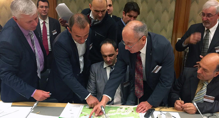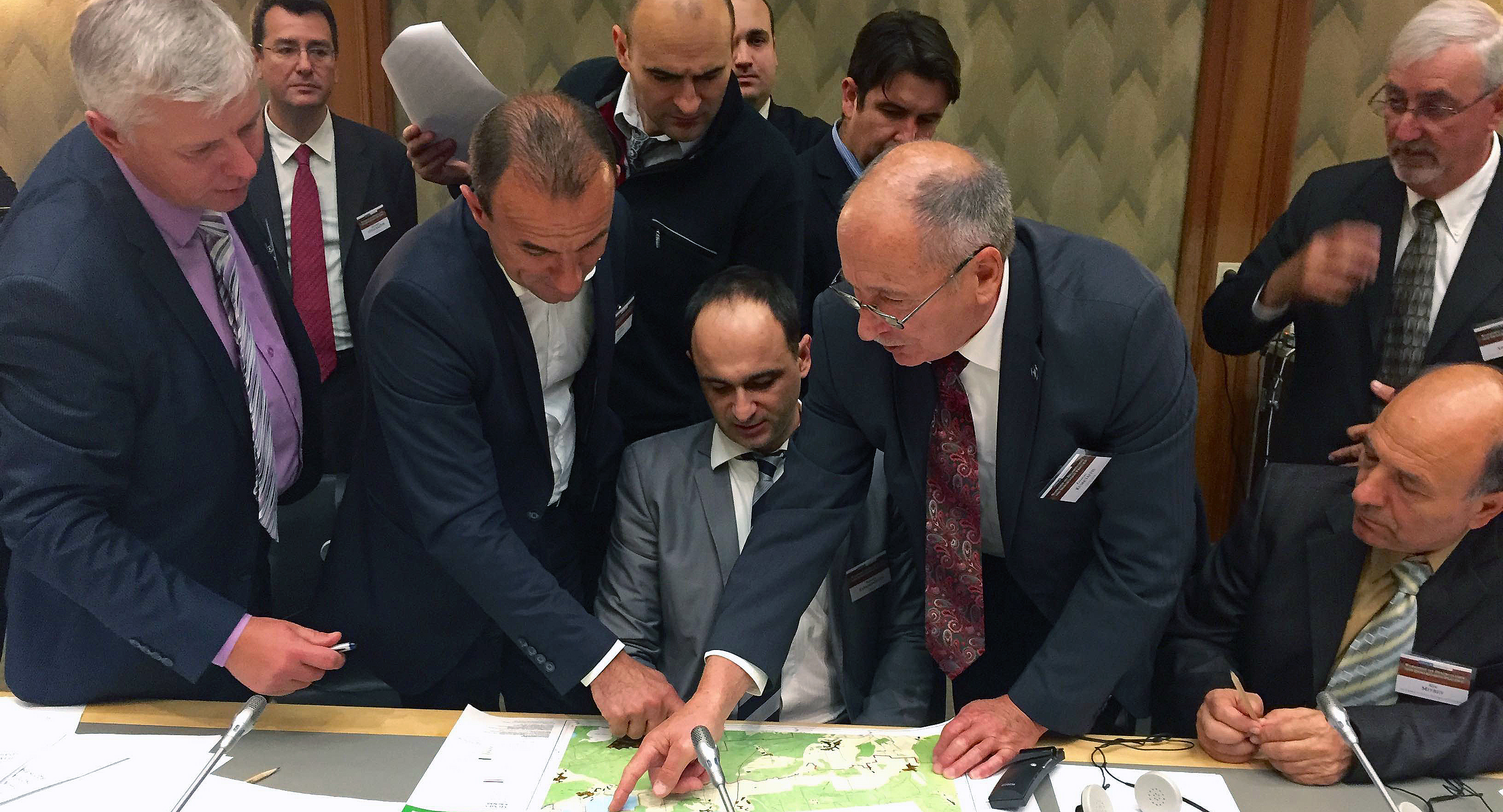 Representatives of national boundary commissions from various OSCE participating States discussing the legal aspects of international boundaries and specific national experiences, Vienna, 2 November 2016.
