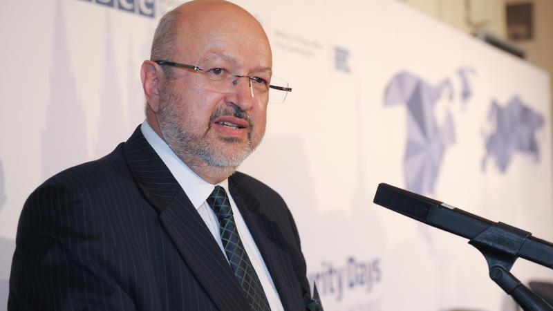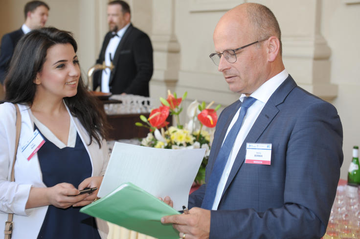 Diana Rusu (l), freelance foreign affairs journalist, with Matthijs Berman, Principal Adviser to the Head of Institution, OSCE Representative on Freedom of the Media, during an opening reception at the OSCE Security Days, Prague, 18 May 2017