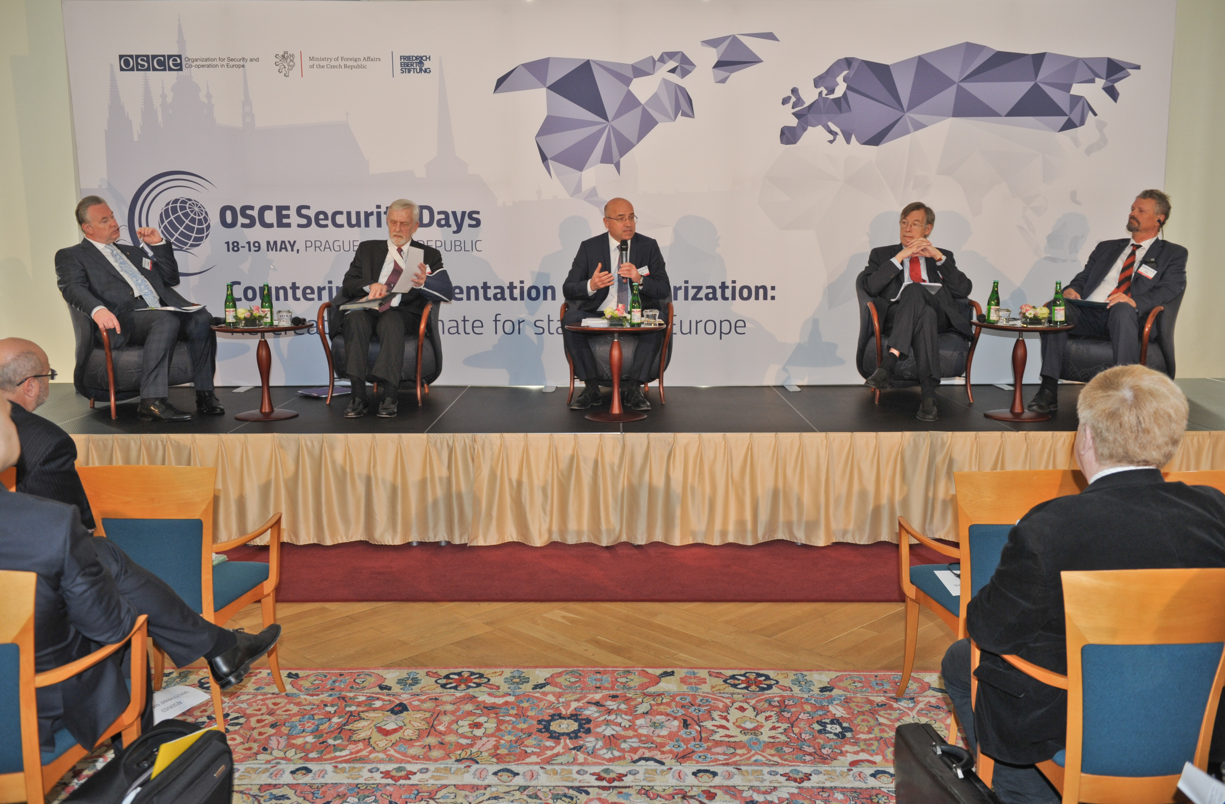 OSCE; William Hill, Professor of National Security Strategy, National War College; Marcel Peško, Director of the OSCE Conflict Prevention Centre; François Heisbourg, Special Adviser, La Fondation pour la Recherche Stratégique and Gernot Erler, Special Representative for the OSCE, German Federal Foreign Office, during an opening session at the OSCE Security Days, Prague, 19 May 2017.