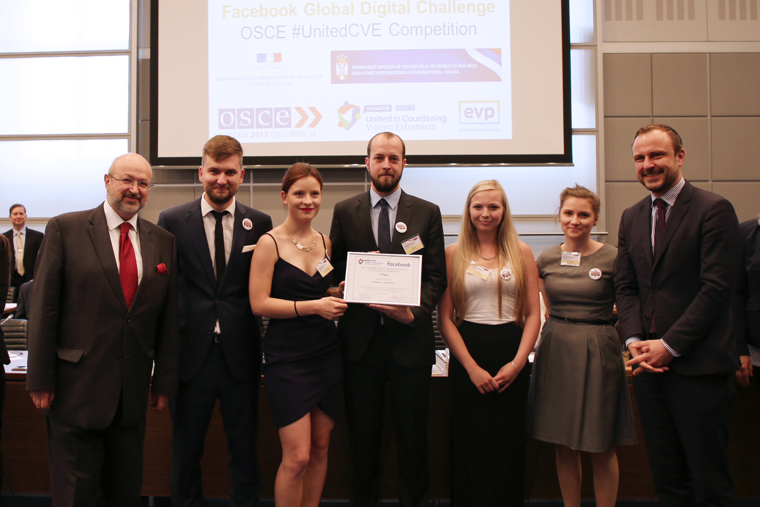 Team from the Masaryk University and the 3d prize winners, receiving the award from the OSCE Secretary General Lamberto Zannier and Prof. Peter Neumann, Special Representative of the OSCE Chairperson-in-Office on the Countering Radicalization and Violent Extremism.