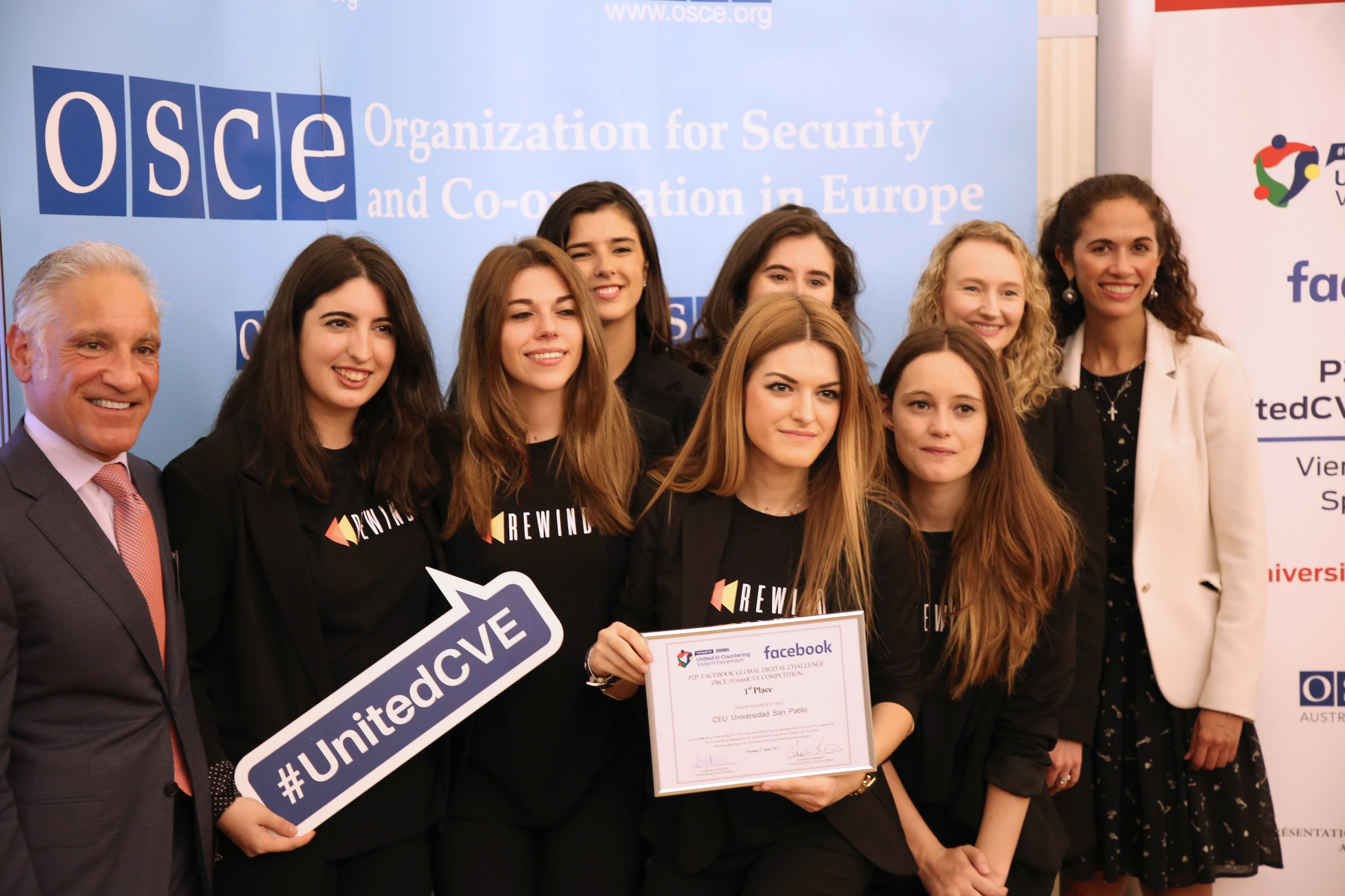 Team from the Universidad CEU San Pablo, Spain, and the 1st prize winners of the OSCE #UnitedCVE regional competition of the Peer to Peer (P2P): Facebook Global Digital Challenge, Vienna, 27 June 2017.