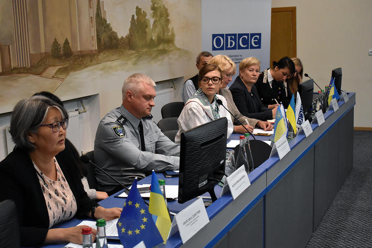 (l-r) OSCE Senior Gender Adviser Amarsanaa Darisuren and Ukraine’s Deputy Interior Minister Anastasiya Deyeva addressing trainees from police mobile groups combating domestic violence at the Dnipro State University of Interior, 4 September 2017.