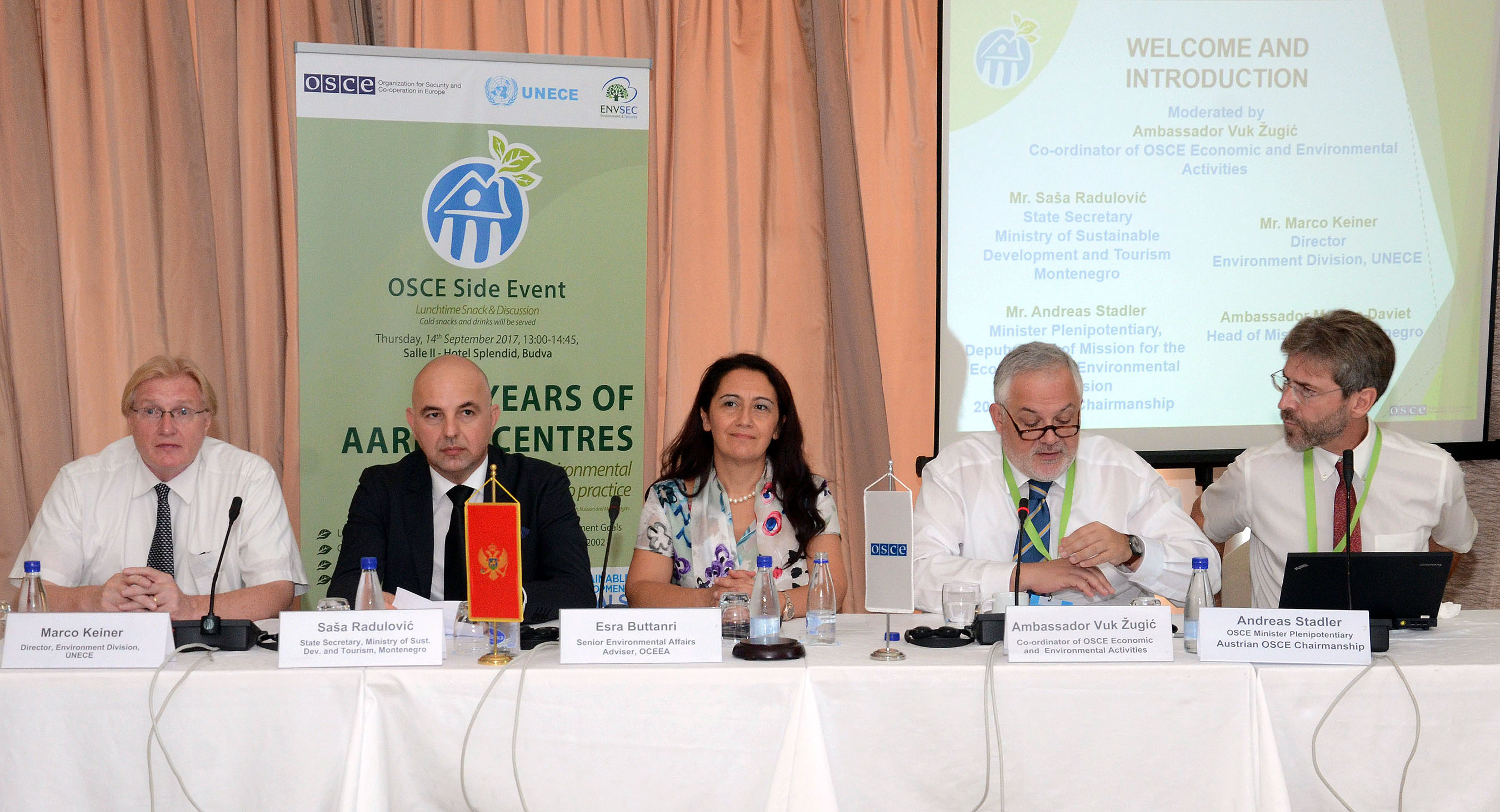 (l-r) Marco Keiner, Director, Environment Division, UNECE), Saša Radulović, State Secretary, Ministry of Sustainable Development and Tourism of Montenegro, Esra Buttanri, Senior Environmental Affairs Adviser, OCEEA, Ambassador Vuk Žugić, Co-ordinator of OSCE Economic and Environmental Activities and Andreas Stadler, OSCE Minister Plenipotentiary, 2017 Austrian OSCE Chairmanship during the Aarhus Centres 2017 Annual Meeting, Budva, 14 September 2017.