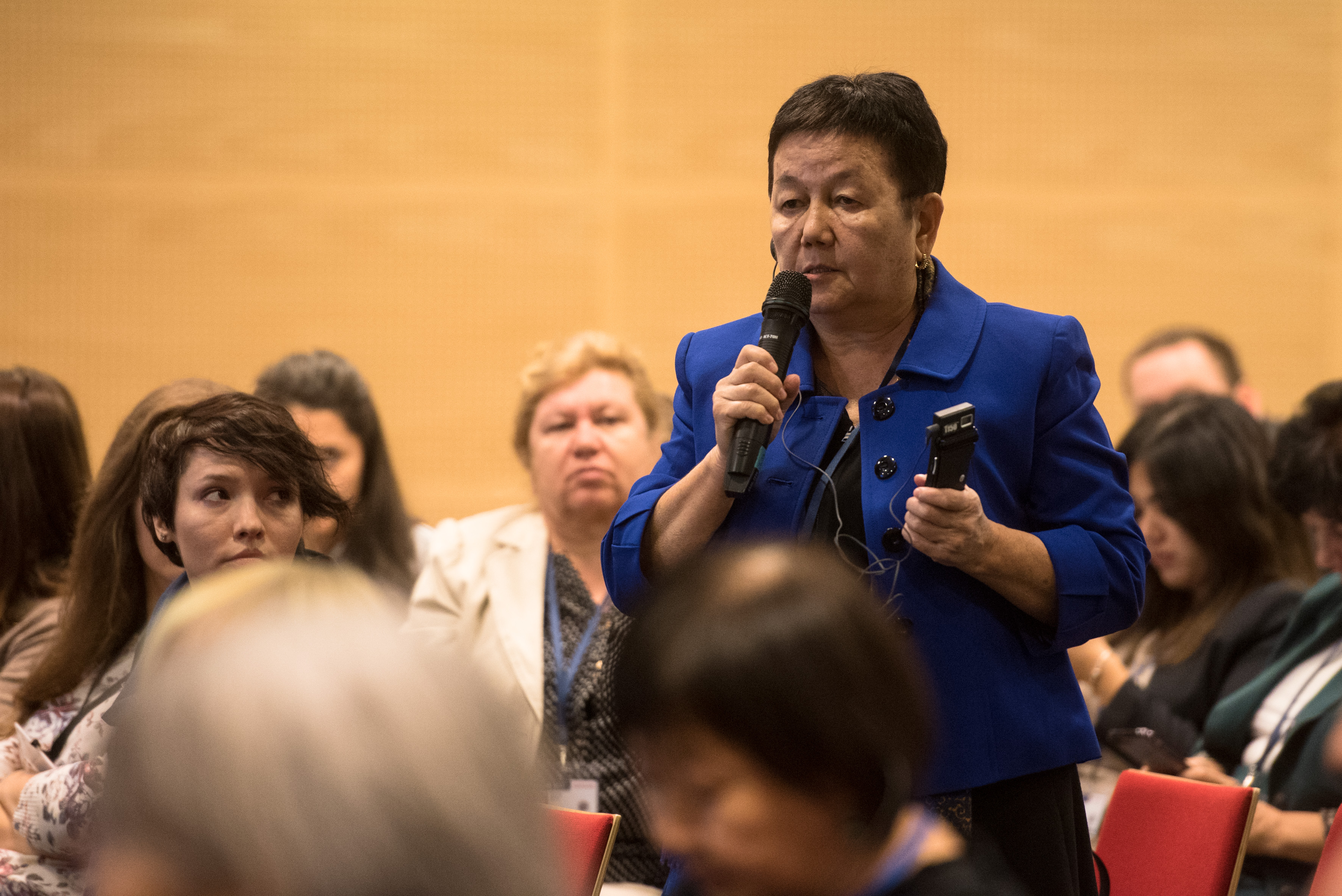 A participant poses a question to the panelists at a side event on preventing violence against women organized by the OSCE Gender Section, UN Women and UNFPA on 21 September 2017.
