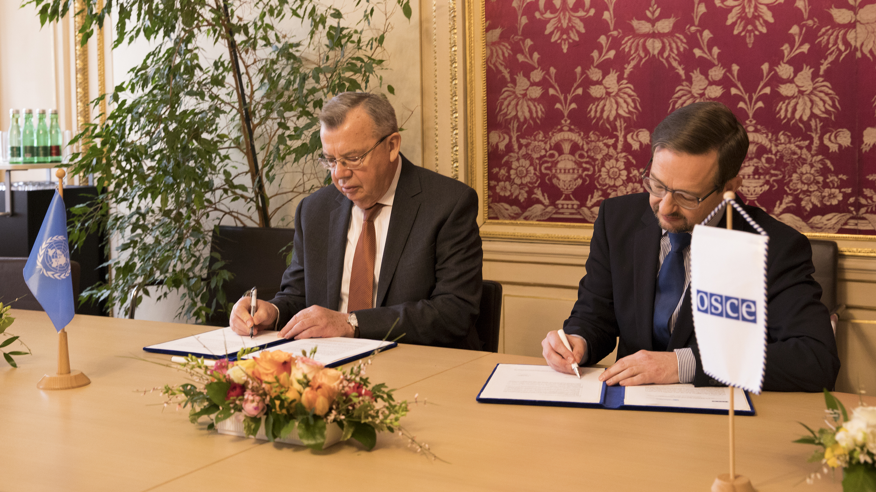 Executive Director of the United Nations Office on Drugs and Crime (UNODC) Yuri Fedotov and OSCE Secretary General Thomas Greminger signing the OSCE-UNODC 2018-2019 Joint Action Plan at the OSCE Secretariat in Vienna on 31 January 2018