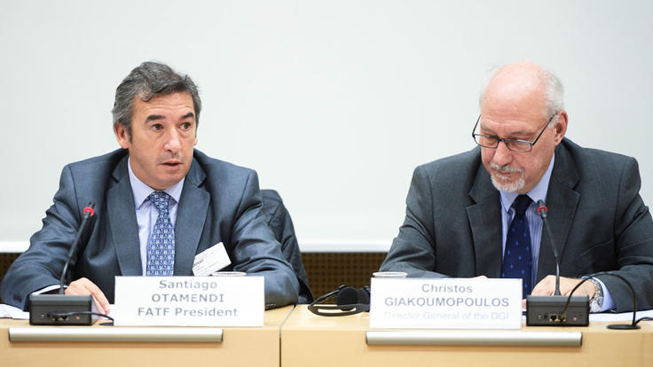 Santiago Otamendi (l), President of the Financial Action Task Force (FATF) and Christos Giakoumopoulos, Director General of Human Rights and Rule of Law (DGI) of the Council of Europe, speaking at the workshop, Strasbourg, 26 March 2018.