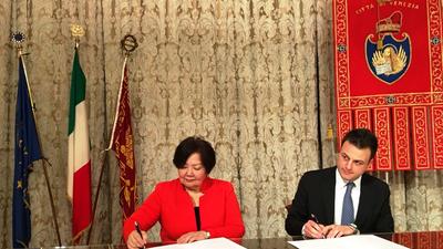 VENICE, 12 April 2018 - The Commissioner of the Municipality of Venice, Mr. Simone Venturini, and the OSCE Special Representative and Co-ordinator for Combating Trafficking in Human Beings, Madina Jarbussynova, signed an agreement today strengthening co-operation between the OSCE and the Municipality of Venice regarding victim protection and the fight against organized criminal networks involved in trafficking.