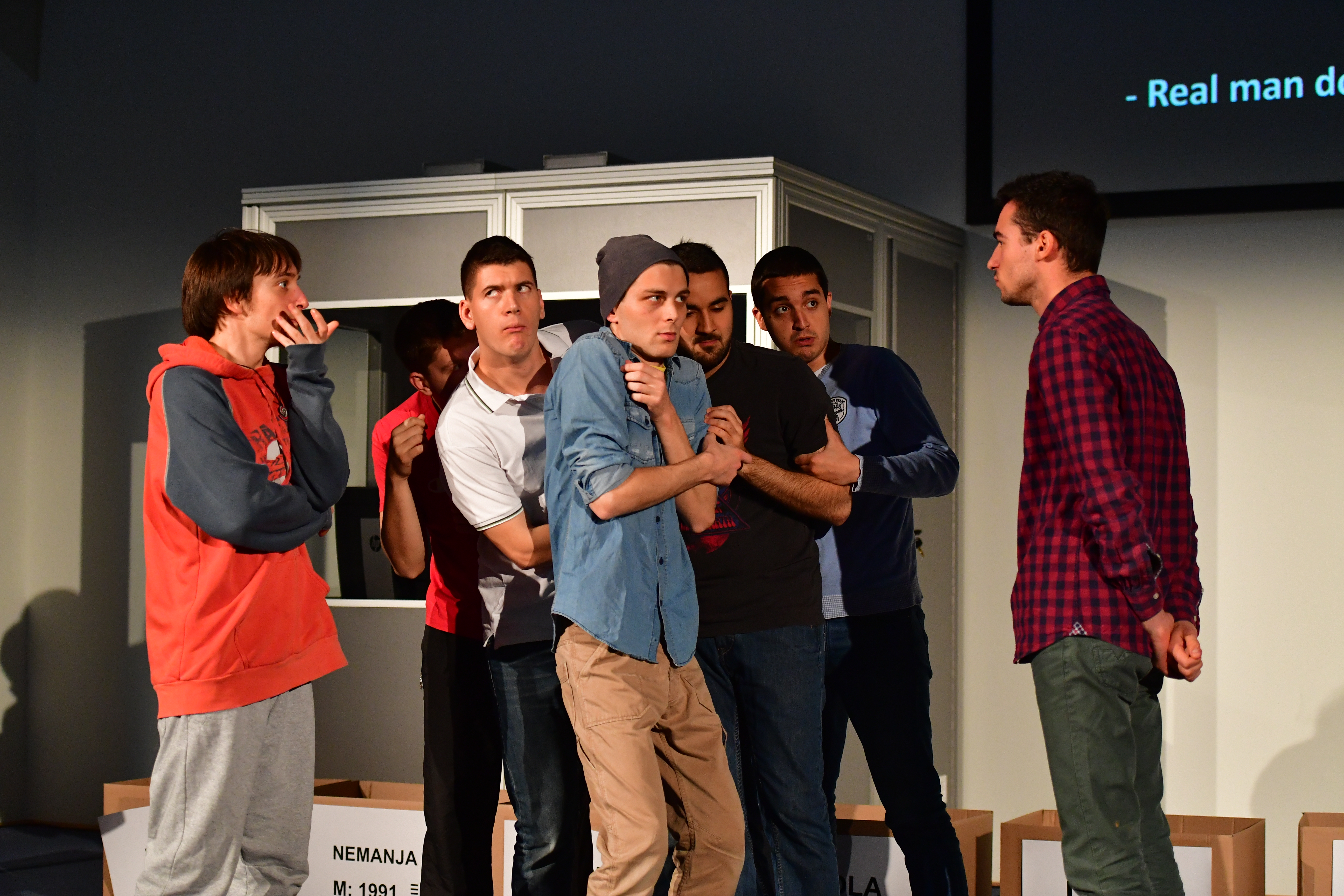 A scene from a theatre play entitled Macho Men performed by Serbian Theatre, 'Reflektor' at the OSCE MenEngage Expert Meeting, Vienna, 23 November 2017.