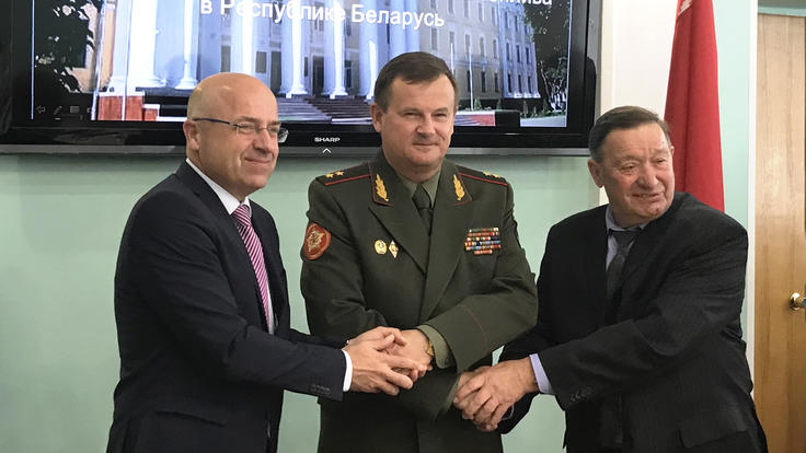 Marcel Peško (l-r), Director of the OSCE Conflict Prevention Centre, Andrei Ravkov, Belarus Defence Minister and Sergey Ushakov, Director General of Technoazot company (Implementer), signing the final certificate of the joint project, removal of highly toxic rocket fuel components in Belarus, Minsk, 11 June 2018.