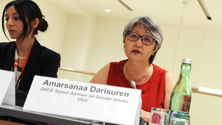 Amarsanaa Darisuren (c), OSCE Senior Adviser on Gender Issues, delivers welcoming remarks with Graziella Pavone, Human Rights Officer at the Office for Democratic Institutions and Human Rights, at a side event on combating violence against women in conflict settings, Vienna, 2 July 2018.