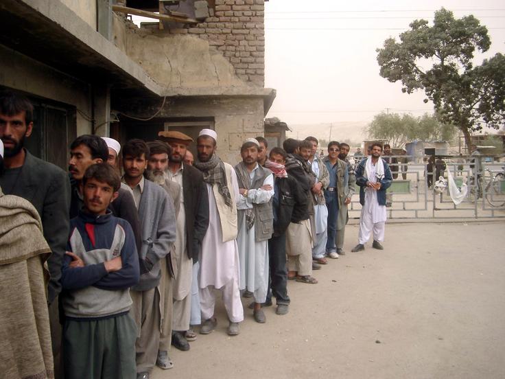 Afghan voters waiting to enter a polling station in Kabul to vote for a new president, 9 October 2004.