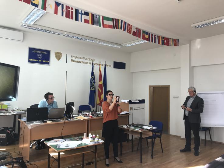Participant identifying security features in a passport during the advanced training course on the detection of forged documents, Skopje, 18 October 2019.