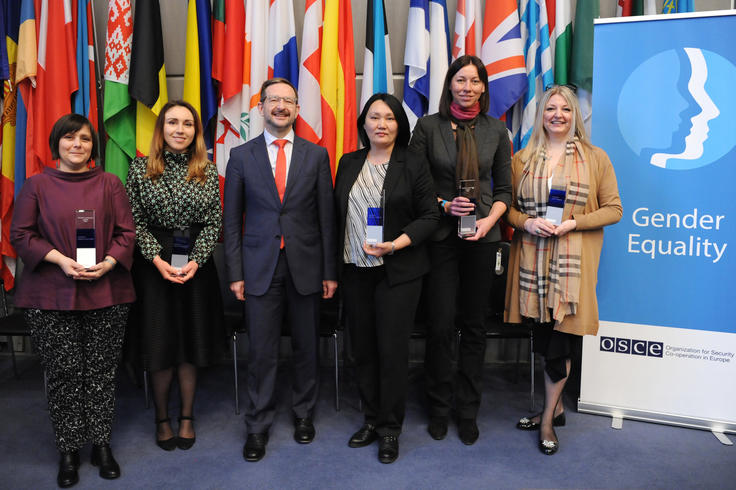 Winners of the OSCE Gender Champions Award recognized for their contribution in advancing gender equality and OSCE Secretary General Thomas Greminger, 12 March 2020, Vienna.