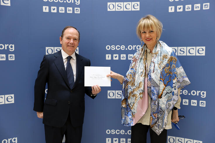 H.E. Cristóbal Ramón Valdés, Ambassador and Permanent Representative of Spain to the OSCE, with OSCE Secretary General Helga Maria Schmid, Vienna, 4 October 2021.