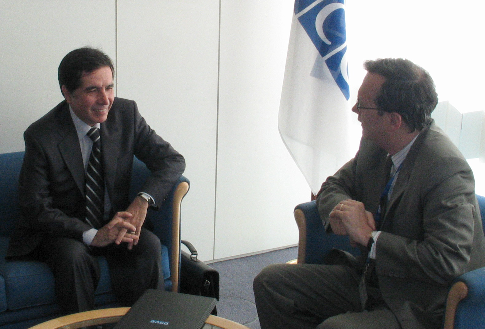 OSCE Secretary General, Marc Perrin de Brichambaut (right), with Afghan Ambassador Zia Nezam in Vienna 15 July 2005. They discussed dispatching an OSCE support team to assist Afghanistan with the September parliamentary and provincial council elections.