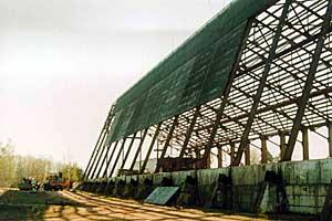 The OSCE regularly inspected the dismantling process of the Skrunda Radar Station in Latvia. Here, the front of an antenna building is removed of most technical equipment and weather protection in July 1998. The dismantling was completed in October 1999.