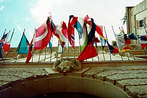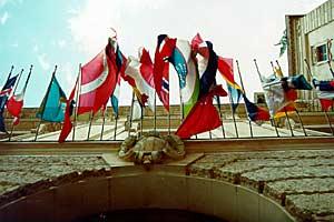 Flags of the 55 OSCE participating States at the Hofburg Congress Centre in Vienna.