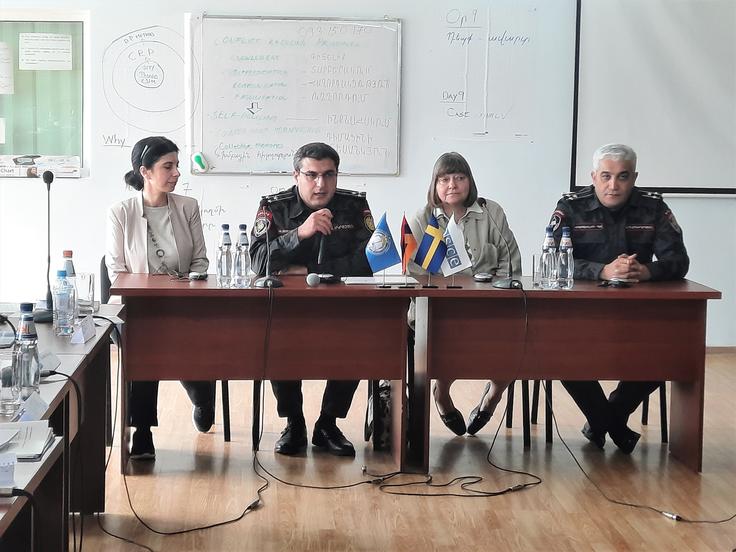 From left: Ruzanna Baghdasaryan, OSCE National project coordinator, Armen Mkrtchyan, Head of Armenia Police Headquarters, Annika Nordin Jayawardena, Deputy Head of Mission, Embassy of Sweden in Armenia and Manuk Muradyan, Head of the Armenia Police Education Complex, closing the dialogue police training at the Police Education Complex in Yerevan, Armenia, 12 May, 2022.