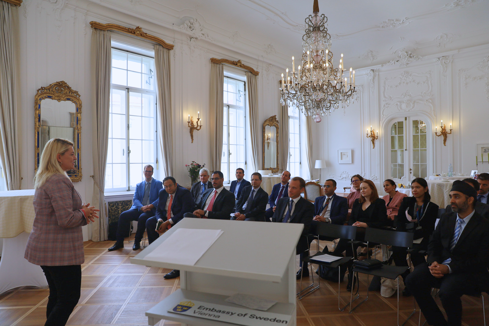 Gorica Atanasova Gjorevska, Minister Plenipotentiary at the Permanent Mission of North Macedonia, and Ludvig Bontell (seated centre), Deputy Permanent Representative of Sweden to the OSCE, welcome participants during a networking event at Schwedenhaus, Vienna, 19 September 2022.
