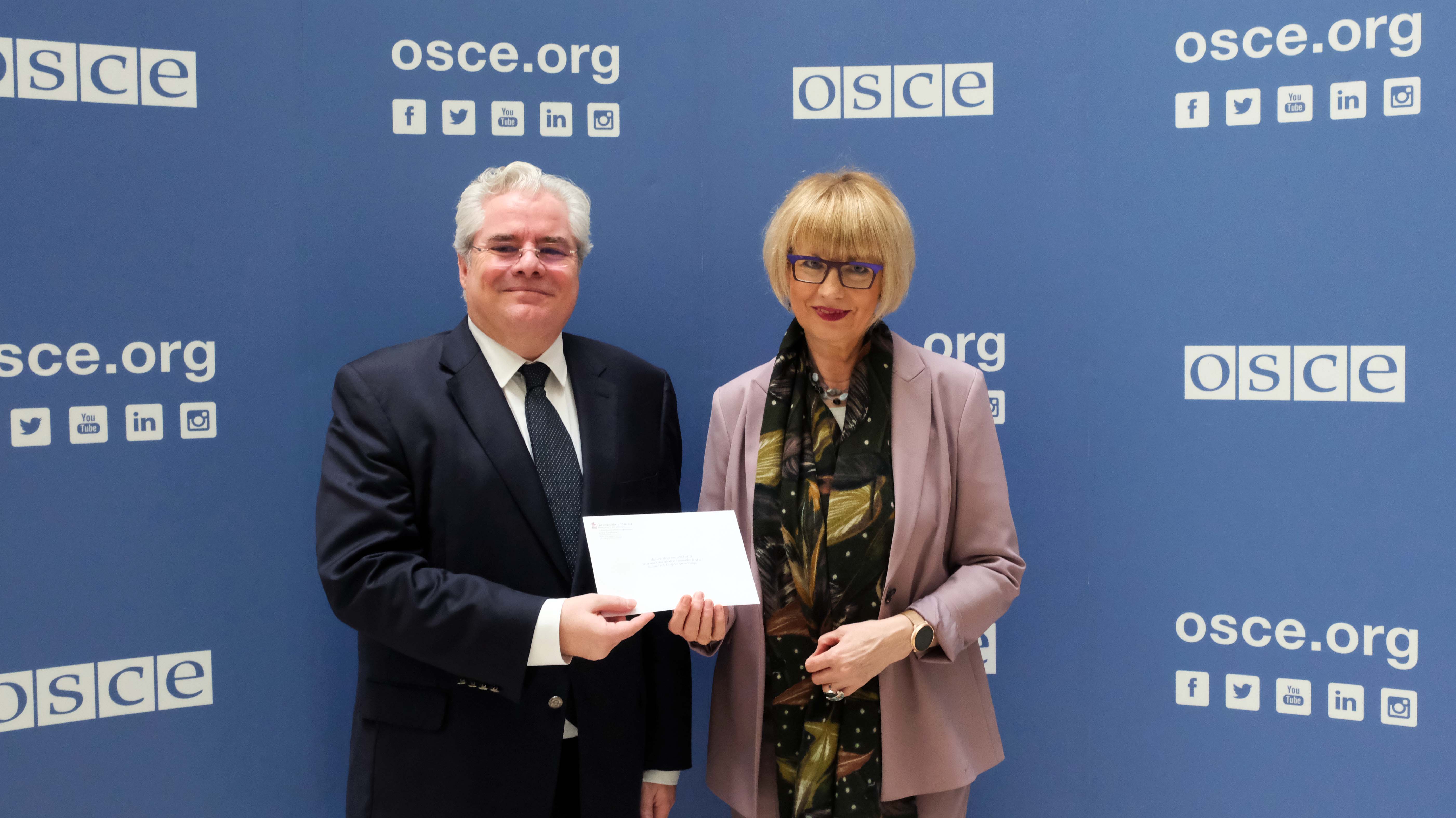 H.E. Lorenzo Ravano, Ambassador and Permanent Representative of the Principality of Monaco to the OSCE, with the OSCE Secretary General Helga Maria Schmid, Vienna, 19 October 2022.