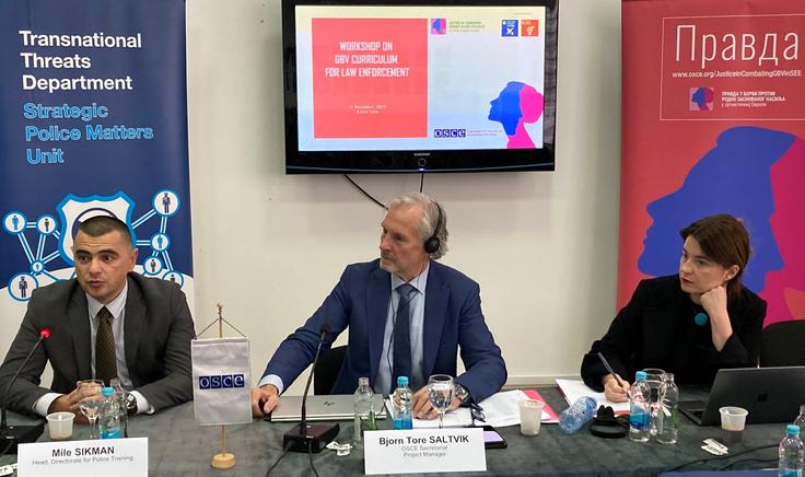 Prof. dr Mile Šikman, Head of the Directorate for Police Training, and Bjorn Tore Saltvik, Adviser on Police Reform and Project Manager at OSCE Secretariat, speaking at the workshop on gender-based violence, Banja Luka, 14 November 2022.