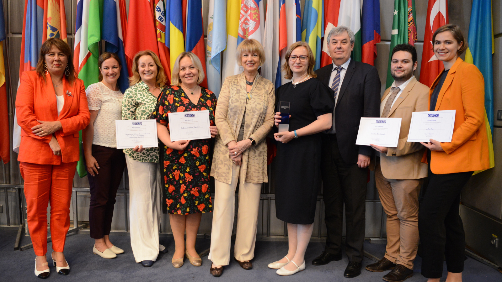 OSCE Secretary General Helga Maria Schmid, OSCE Senior Adviser on Gender Issues Lara Scarpitta and Chairperson of the OSCE Permanent Council Ambassador Igor Djundev with the winners of Gender Champions Award, Vienna, 13 July 2023.