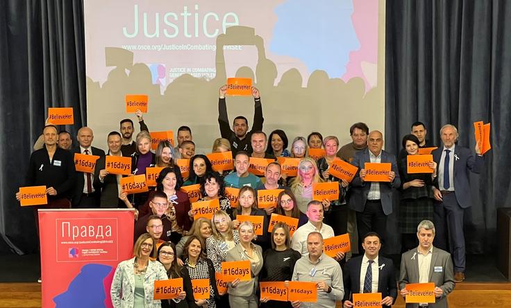 Participants of the OSCE training on gender-responsive policing of violence against women and girls holding banner in support of the 2023 OSCE 16 Days campaign, Vrnjačka Banja, 27 November 2023.