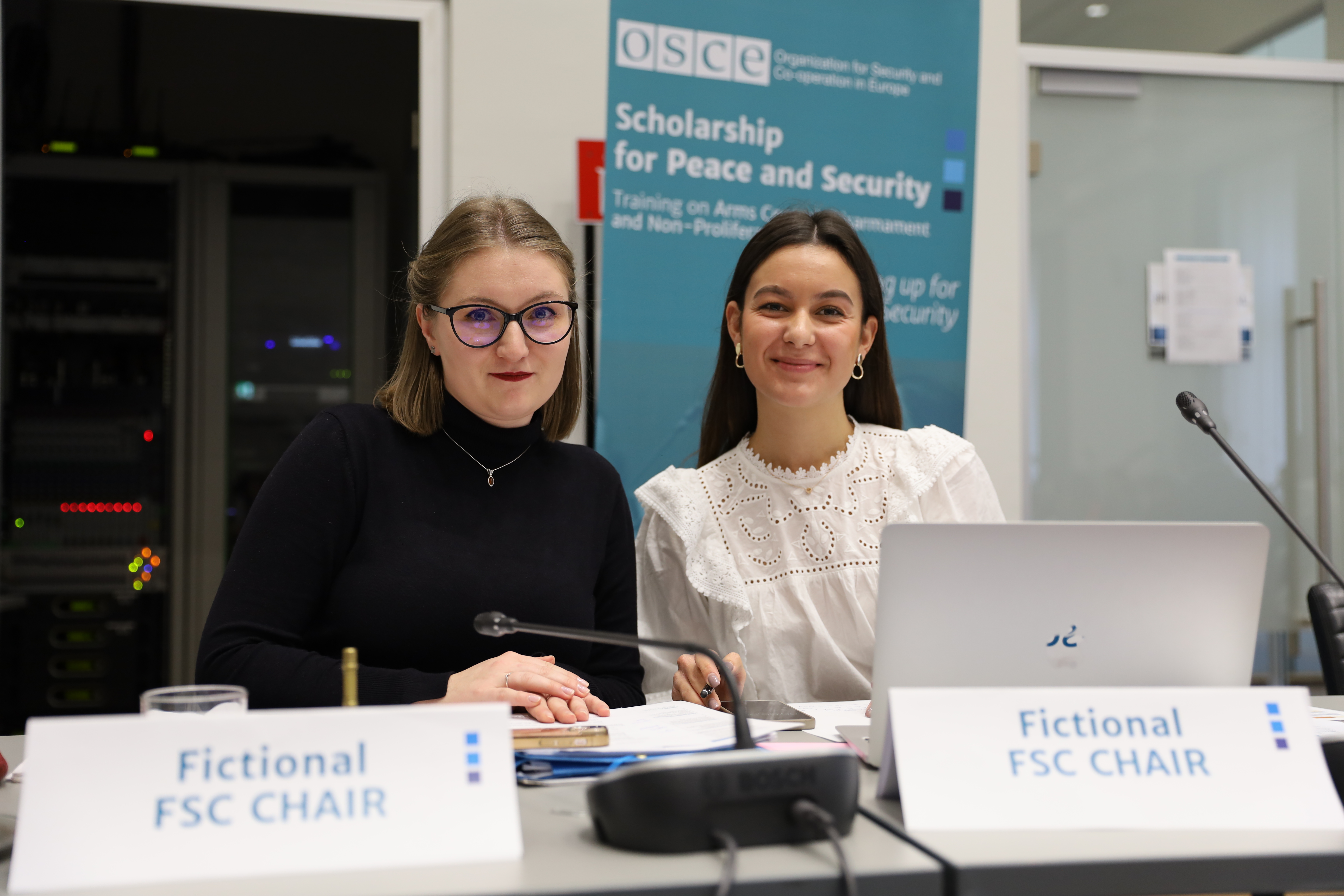 Daria Jankiel from Poland and Kateryna Anisova from Ukraine chairing a fictional meeting of the Forum for Security Co-operation, Vienna, 10 November 2023