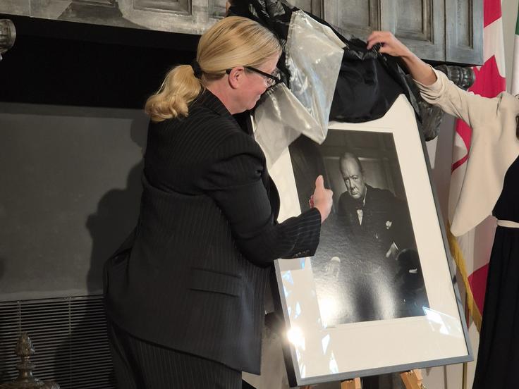 Unveiling the recovered original 'Roaring Lion' portrait by Deputy Minister of Canadian Cultural Heritage Isabelle Mondou during a handover ceremony at the Embassy of Canada in Rome, Italy, on 19 September, 2024.