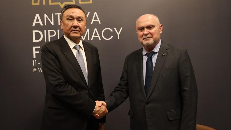 OSCE Secretary General Feridun H. Sinirlioğlu (right) with Kubanychbek Omuraliev (left), Secretary General of the Organization of Turkic States (OTS) at Antalya Diplomacy Forum, 12 April 2025.