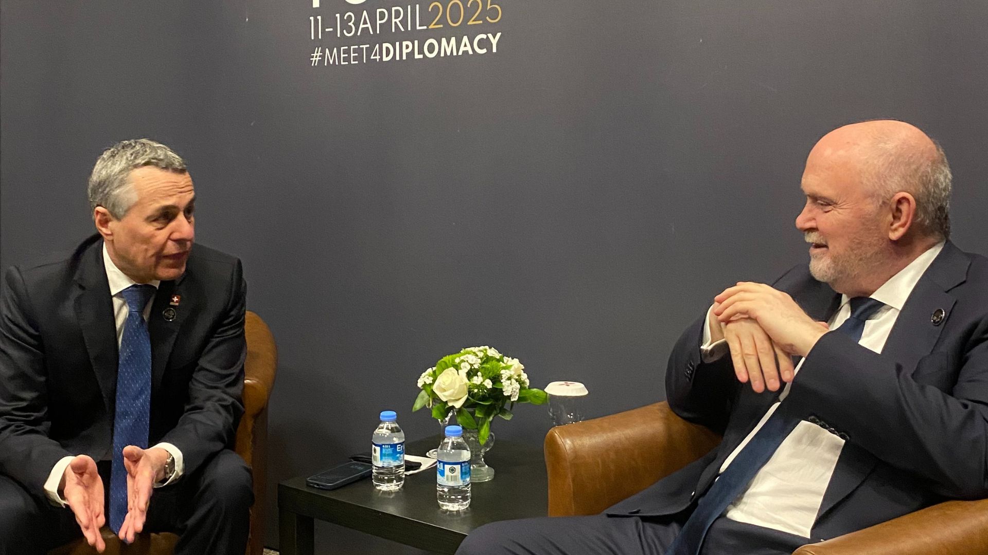 OSCE Secretary General Feridun H. Sinirlioğlu (right) with Ignazio Cassis (left), Minister of Foreign Affairs of Switzerland at Antalya Diplomacy Forum, 11 April 2025.