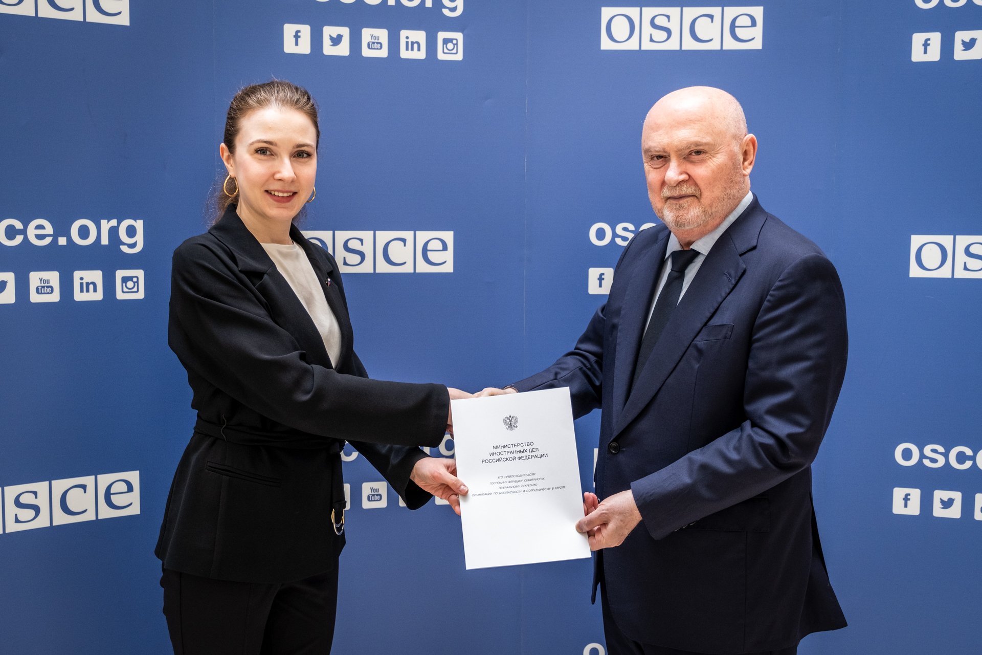 Ms. Iuliia Zhadanova, Head of the Russian Delegation to the Vienna Negotiations on Military Security and Arms Control, with the OSCE Secretary General Feridun H. Sinirlioğlu, Vienna, 20 May 2025.