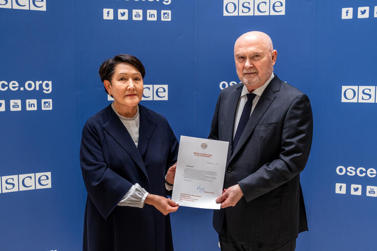 H.E. Nurzhana Shaildabekova, Ambassador and Permanent Representative of Kyrgyzstan to the OSCE, with the OSCE Secretary General Feridun H. Sinirlioğlu, Vienna, 23 May 2025.