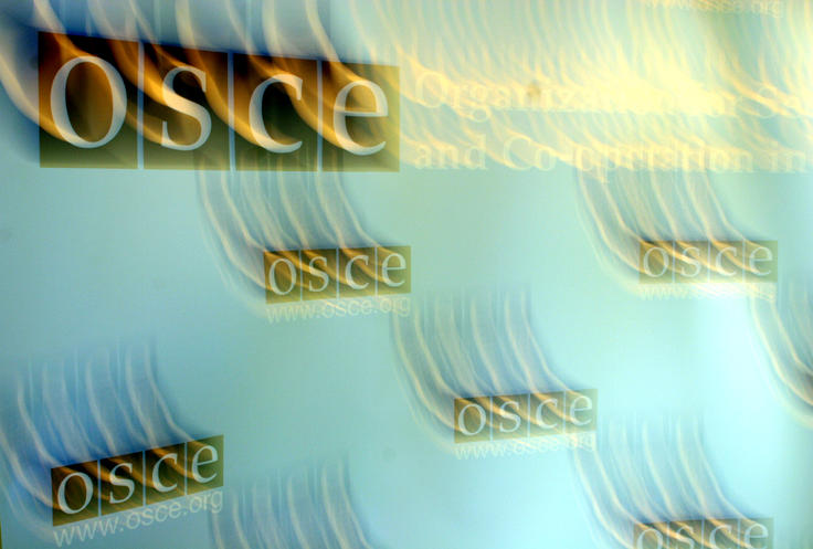 The OSCE logos on a backdrop are seen in a time exposure photograph taken at the Hofburg Congress Centre in Vienna 18 July 2006.