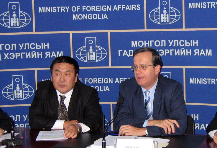 OSCE Secretary General Marc Perrin de Brichambaut (Right) at a news conference at the Mongolian Foreign Ministry, 9 October 2006.