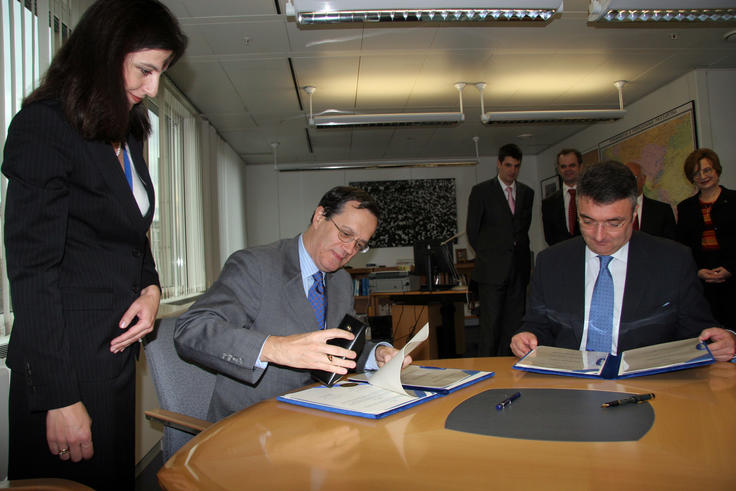OSCE Secretary General Marc Perrin de Brichambaut (left) and Montenegrin Foreign Minister Miodrag Vlahovic sign a memorandum of understanding between Montenegro and the Organization, in Vienna, 24 October 2006.