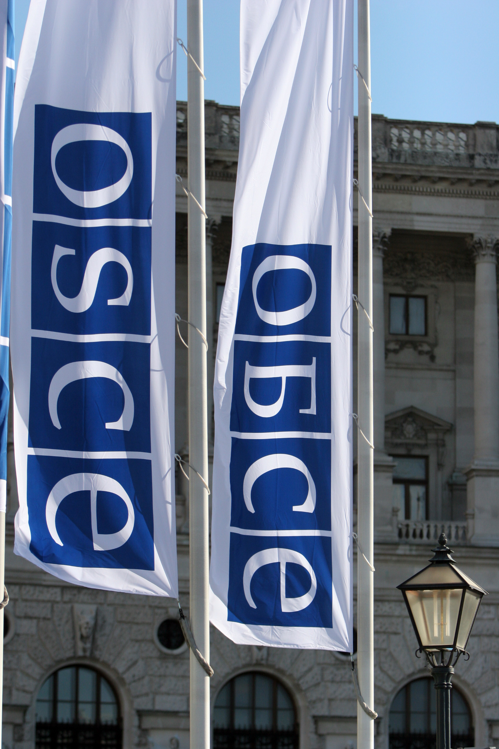 Flags with the OSCE logo in Russian and English in front of the Hofburg in Vienna, 14 February 2007.