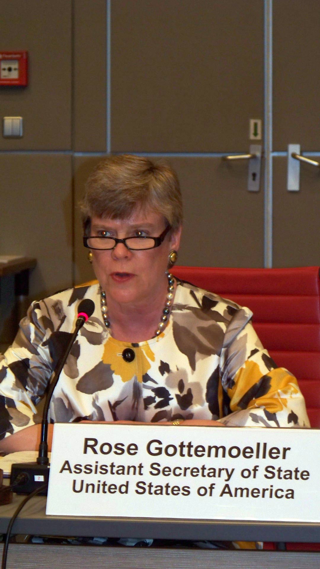 US Assistant Secretary of State, Rose Gottemoeller, delivers her statement at the Closing Session of the Second Review Conference for the Open Skies Treaty, 9 June 2010.