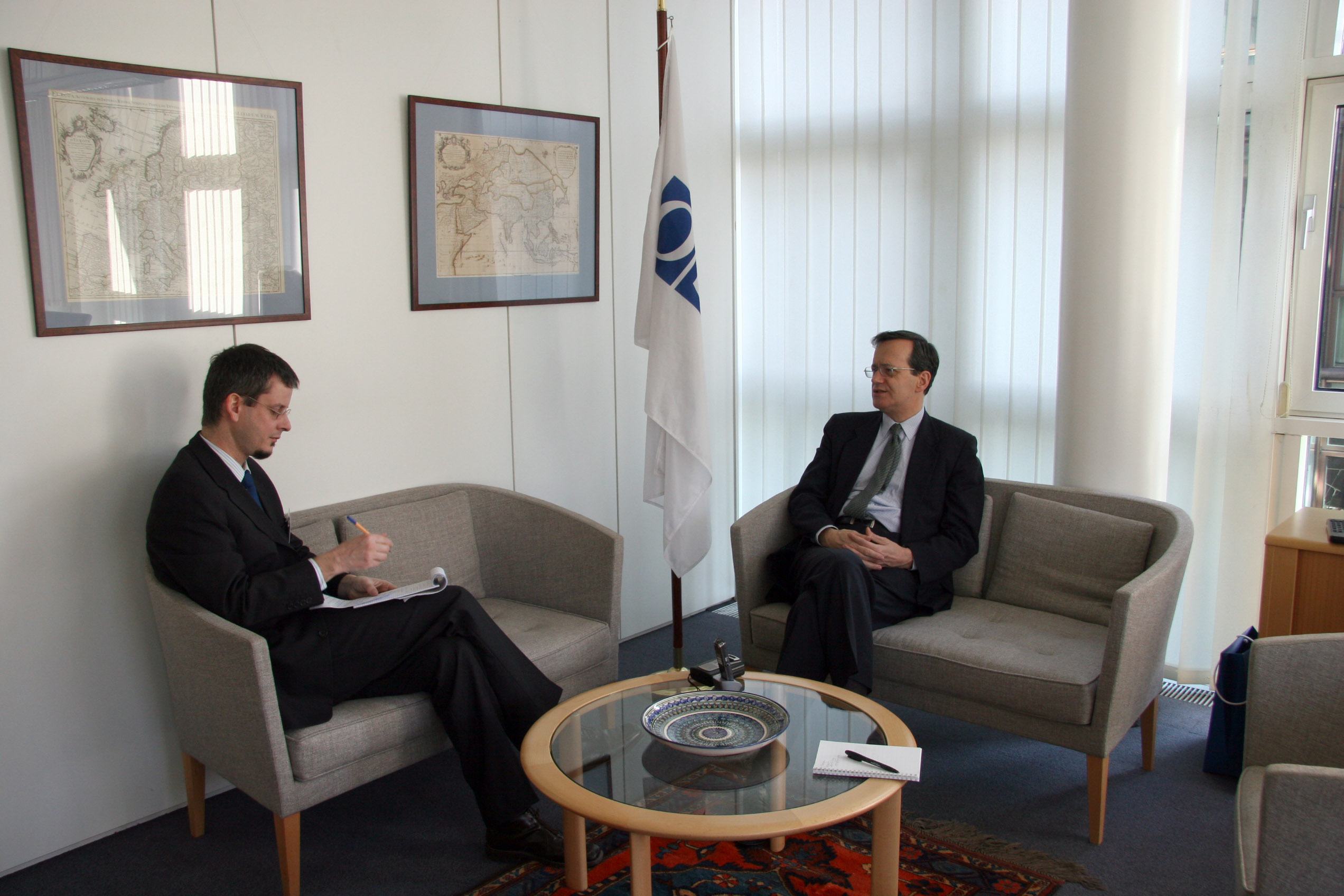 OSCE Secretary General Marc Perrin de Brichambaut during an interview with Markus Bernath (left) of Der Standard, in Vienna, 5 April 2007.