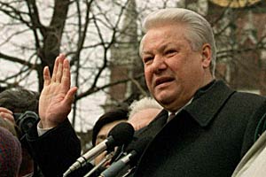 Russian President Boris Yeltsin waves to supporters during a rally in front of the Kremlin in Moscow. Yeltsin died on 23 April 2007.