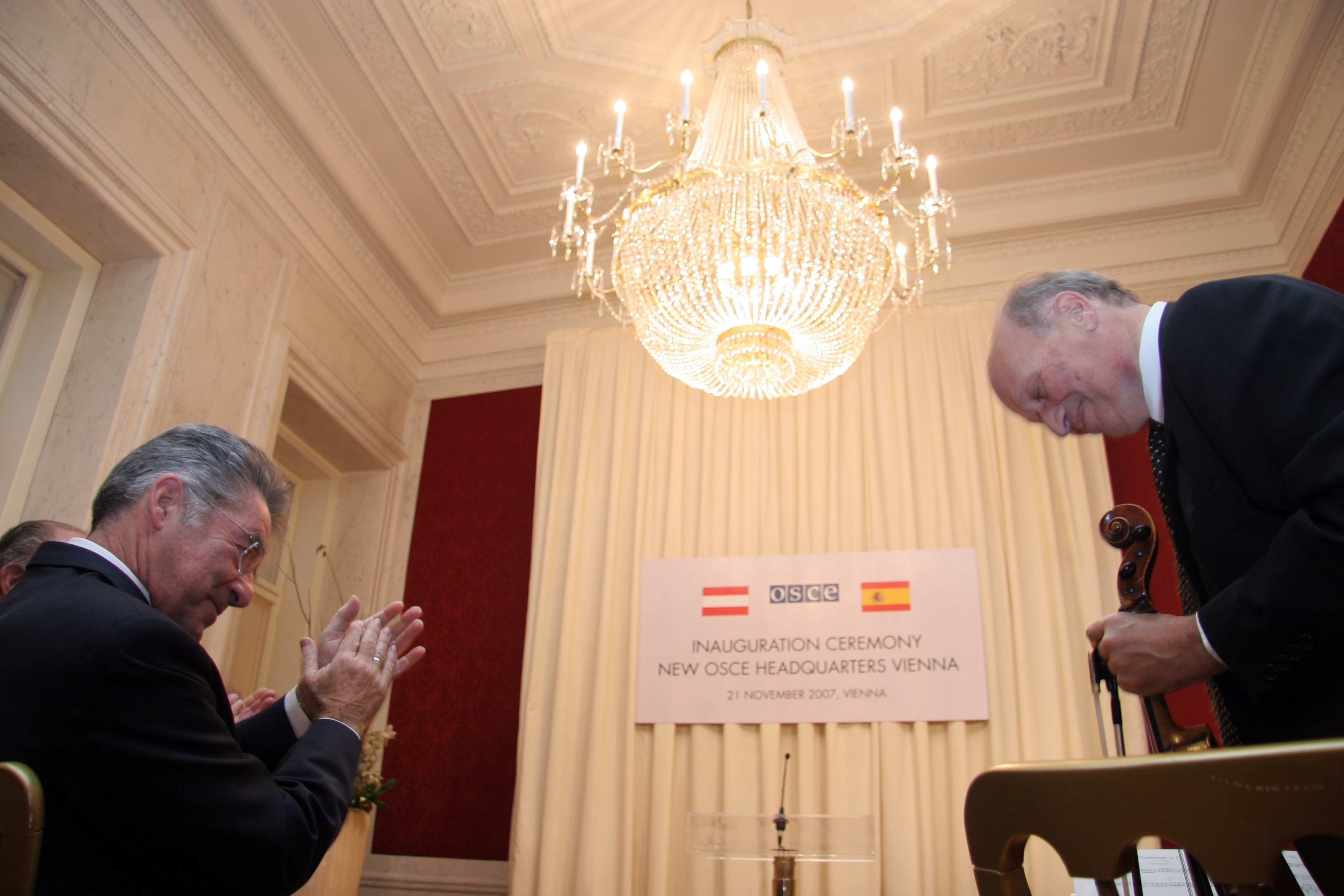 Austrian President Heinz Fischer applauds a musician during the inauguration ceremony of the new OSCE Secretariat, in Vienna 21 November 2007.